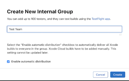 - Create a new internal group, while still on the TestFlight tab, click the blue “+” button next to “Internal Testing”